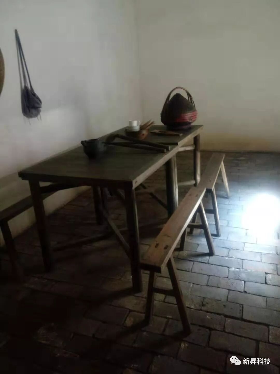△当时红军的生活条件十分艰苦,毛泽东卧室兼办公室内的陈设非常简朴,床铺、桌椅都是房东家的。一张油漆剥落的长条形木桌上,只有一盏马灯、油灯,一方砚台和毛笔。